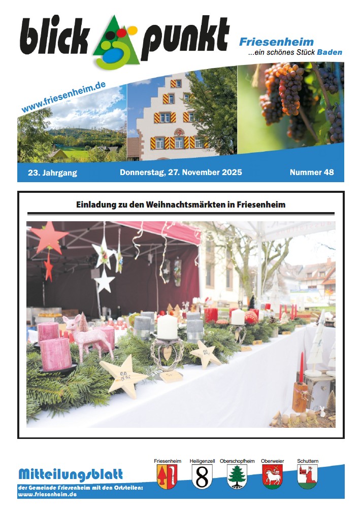 Die Gemeinde Friesenheim gibt seit dem 1. April 1975 zur Veröffentlichung amtlicher Bekanntmachungen, sonstiger amtlicher Mitteilungen und zur Information der Bevölkerung über kommunale Angelegenheiten ein Amtsblatt heraus. Es führt die Bezeichnung "Blickpunkt". Das Amtsblatt erscheint wöchentlich, in der Regel donnerstags. Falls der Donnerstag auf einen Feiertag fällt, erscheint das Mitteilungsblatt einen Tag später. Zum Jahreswechsel entfällt in der Regel eine Ausgabe. Die genauen Kalenderwochen, die dies betrifft, werden rechtzeitig im Amtsblatt mitgeteilt. Beiträge im Amtsblatt haben sich an das Gebot der Toleranz, Sachlichkeit und Fairness zu halten. Das Amtsblatt ist das öffentliche Bekanntmachungsorgan der Gemeinde Friesenheim nach der Satzung über die Form der öffentlichen Bekanntmachungen vom 15. Dezember 1980. Durch Anklicken des Titelbildes öffnet sich das Amtsblatt.
