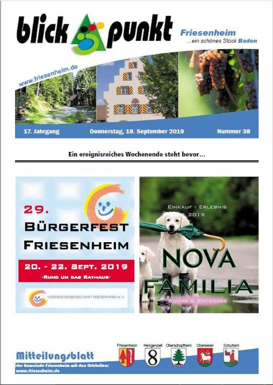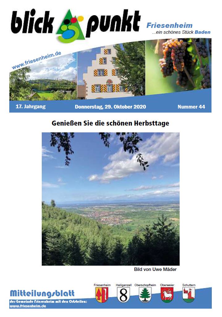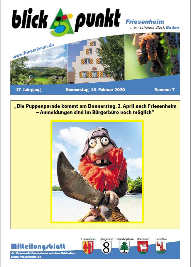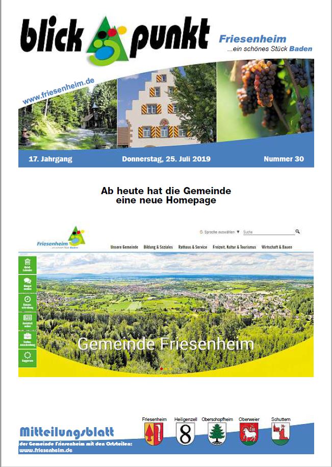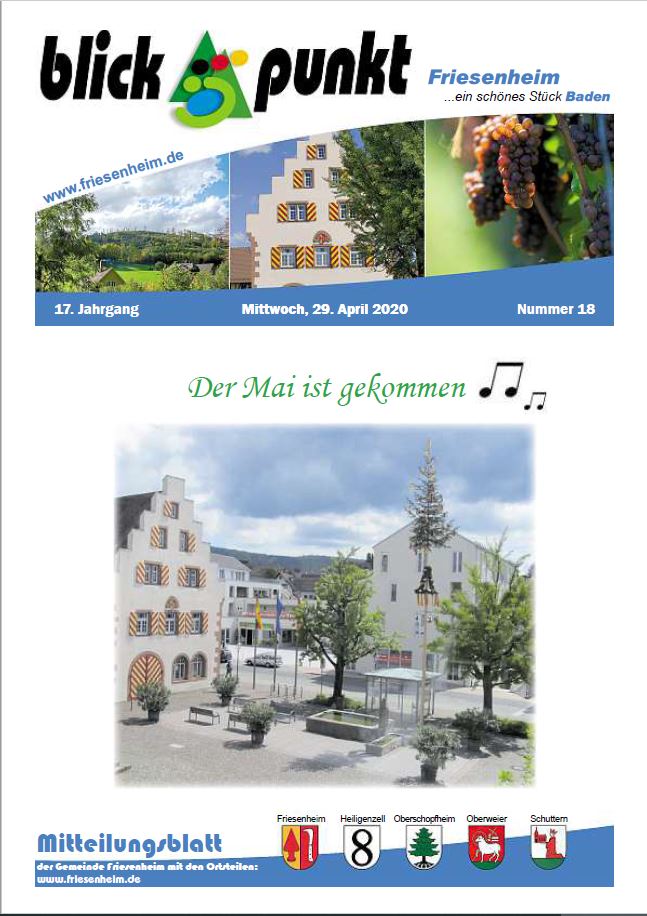 Die Gemeinde Friesenheim gibt seit dem 1. April 1975 zur Veröffentlichung amtlicher Bekanntmachungen, sonstiger amtlicher Mitteilungen und zur Information der Bevölkerung über kommunale Angelegenheiten ein Amtsblatt heraus. Es führt die Bezeichnung "Blickpunkt". Das Amtsblatt erscheint wöchentlich, in der Regel donnerstags. Falls der Donnerstag auf einen Feiertag fällt, erscheint das Mitteilungsblatt einen Tag später. Zum Jahreswechsel entfällt in der Regel eine Ausgabe. Die genauen Kalenderwochen, die dies betrifft, werden rechtzeitig im Amtsblatt mitgeteilt. Beiträge im Amtsblatt haben sich an das Gebot der Toleranz, Sachlichkeit und Fairness zu halten. Das Amtsblatt ist das öffentliche Bekanntmachungsorgan der Gemeinde Friesenheim nach der Satzung über die Form der öffentlichen Bekanntmachungen vom 15. Dezember 1980. Durch Anklicken des Titelbildes öffnet sich das Amtsblatt.
