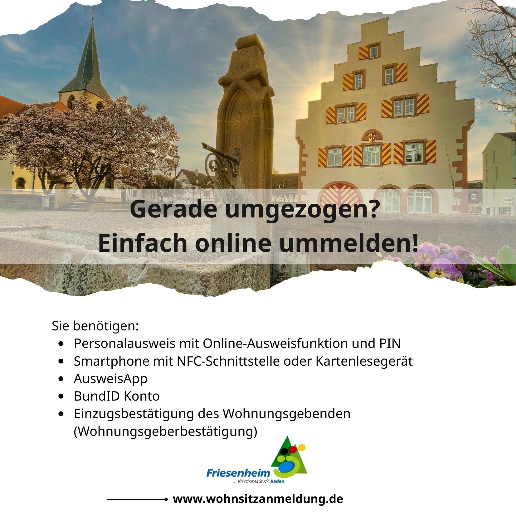 Voraussetzung für die Online-Anmeldung ist ein Smartphone mit der AusweisApp2, ein Personalausweis mit Online-Ausweisfunktion samt PIN, sowie die Wohnungsgeberbestätigung. Der digitale Service ist über das zentrale Portal www.wohnsitzanmeldung.gov.de, Service-BW oder über die Gemeindehomepage Friesenheim erreichbar.