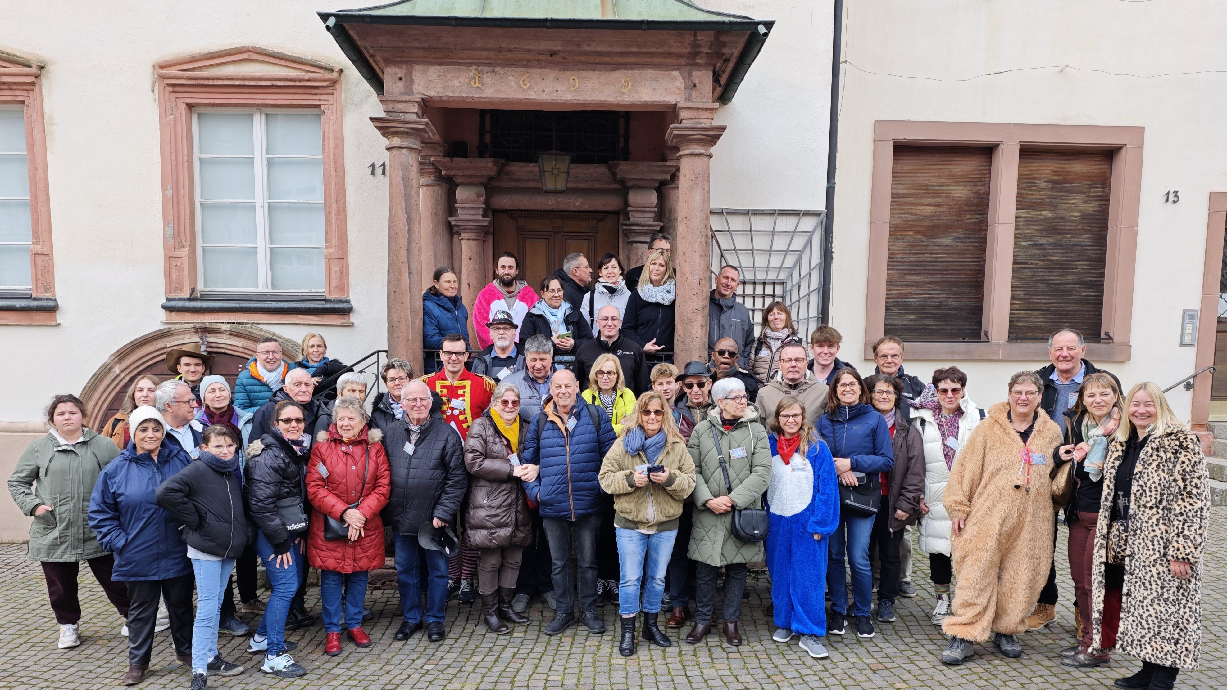Mit 60 Teilnehmern – 41 Gästen aus Tavaux und 19 deutschen Gastgebern – begann der Tag um 12:00 Uhr mit einem herzlichen Empfang im Bürgersaal des Rathauses. Bei Kaffee und Kuchen, umgeben von festlicher Dekoration der Friesenheimer Landfrauen und der Gemeinde, wurden die Gäste auf die närrische Stimmung eingestimmt. Als Gastgeschenk überreichte die Gemeinde eine Kiste mit traditionellen „Badischen Scherben“, passend zur Fasnachtszeit.